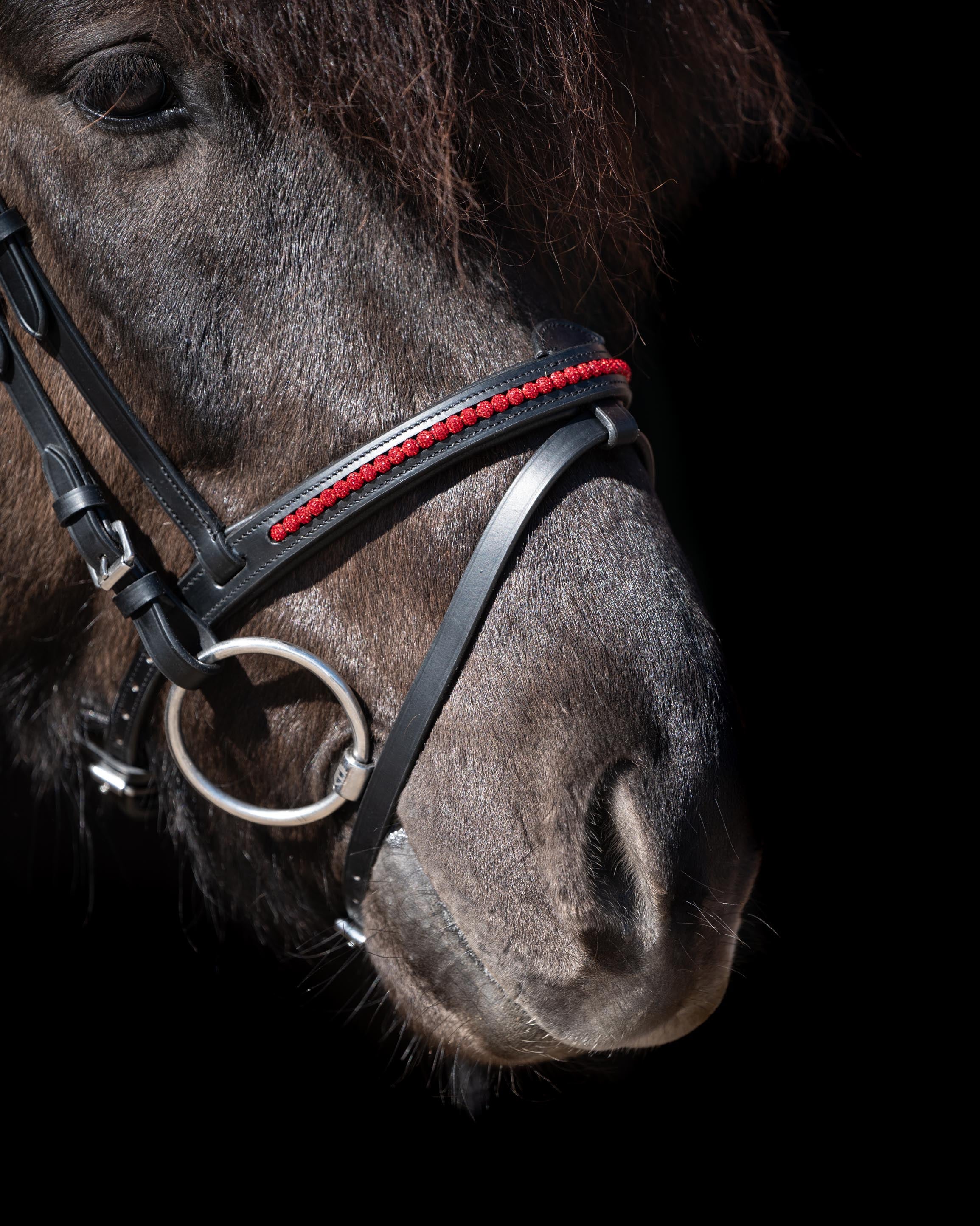 Mit der Trense „Perlur“ bringst du einen feinen, brillanten Akzent in das Training und den Auftritt deines Isländers. Der elegante Glitzer-Effekt des Stirnriemens unterstreicht die klare Linie des Designs. Hochwertiges, weich gepolstertes Leder und anatomische Passform bieten deinem Islandpferd Komfort und Stil in verschiedenen Farben.
